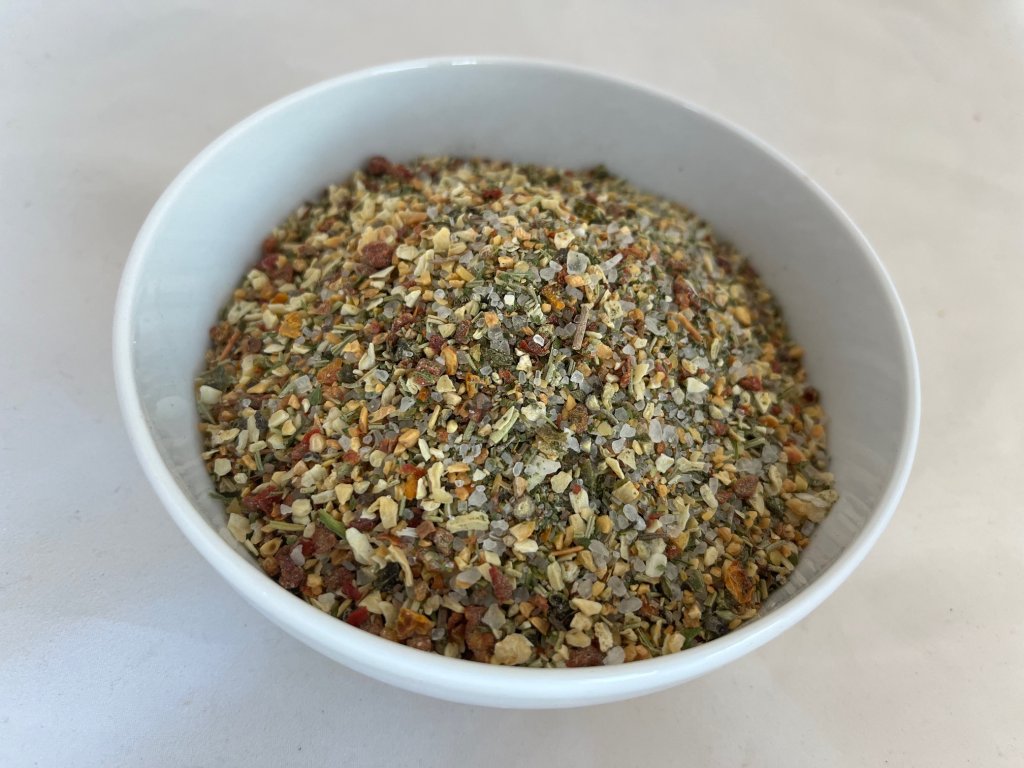 SLOŽENÍ: Sůl hrubozrnná 40%, česnek, rozmarýn, paprikové floky červené, paprikové floky zelené, rajčatové floky, cibule, cukr, petrželová nať, pepř černý, chilli semínka.