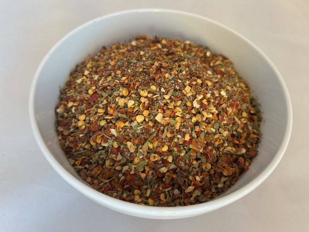 SLOŽENÍ: Mořská sůl 25%, česnek granulovaný, chilli plátky, rajčatové floky, petrželová nať, bazalka.
